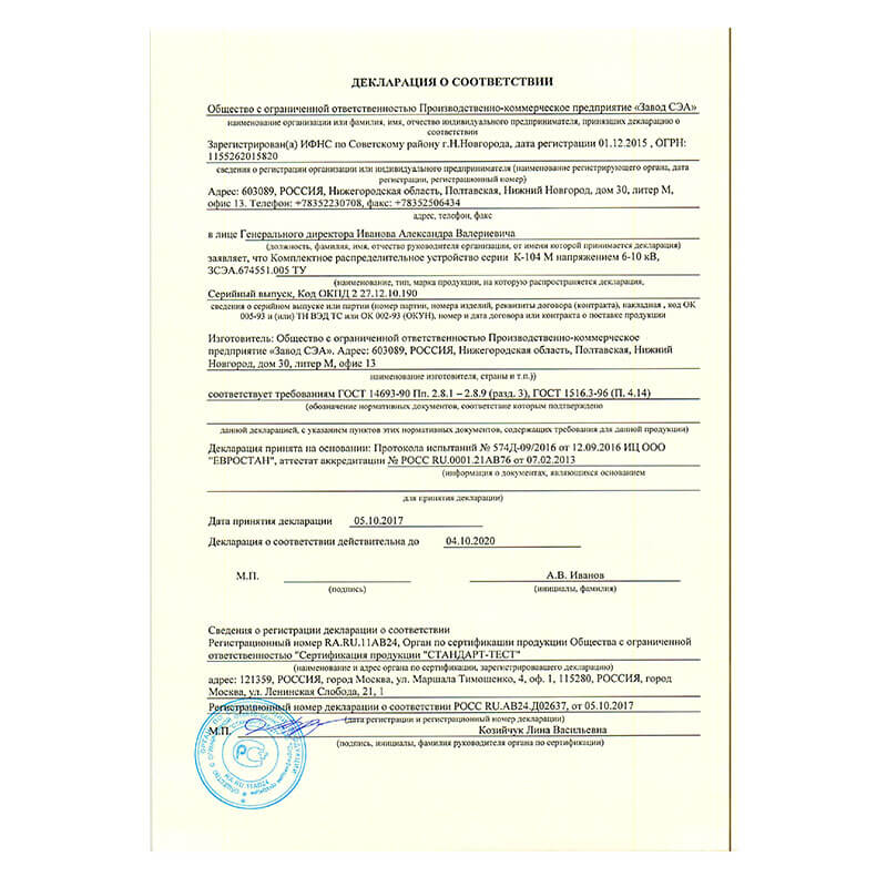 Устройства комплектные распределительные серии К-104М предназначены для работы в электрических установках трехфазного переменного тока частоты 50 и 60 Гц и номинальным напряжением 6 и 10 кВ для системы с изолированной или заземленной через дугогасящий реактор нейтралью и соответствуют техническим условиям ЗСЭА.674551.000 ТУ.
