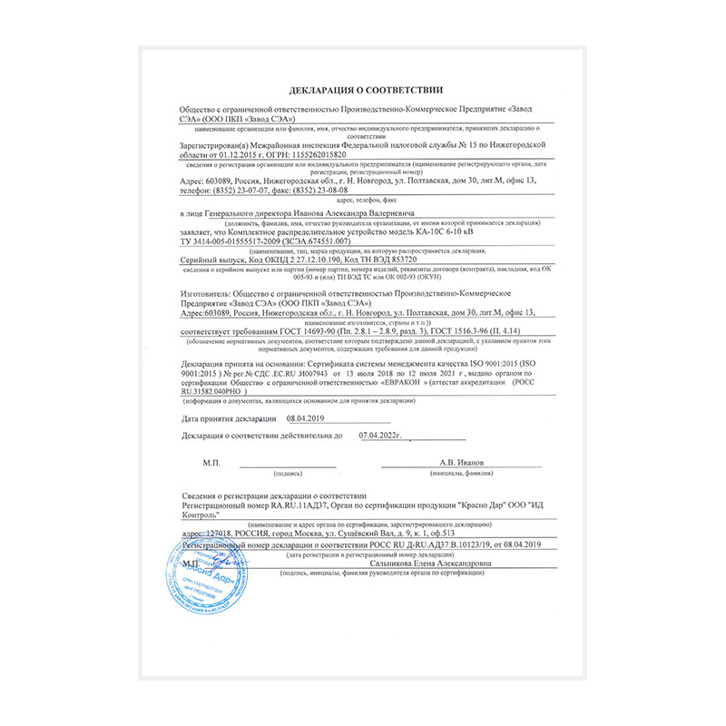 Отличительный индекс производителя ООО «Завод СЭА»